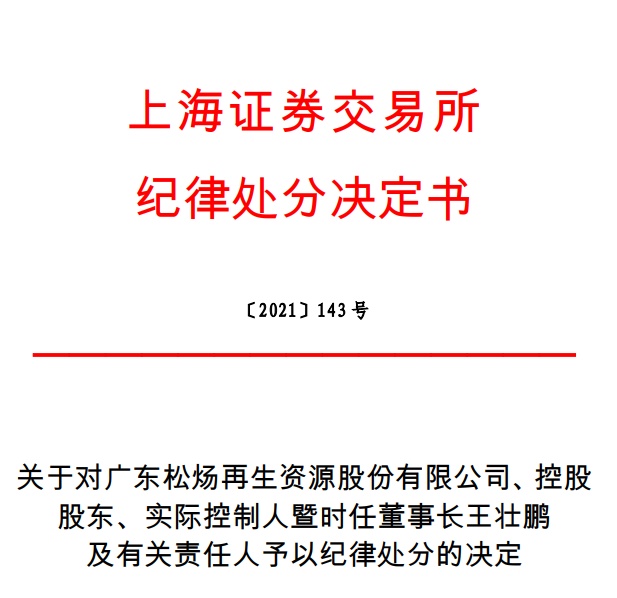 上交所作出如下纪律处分决定:对广东松炀再生资源股份有限公司及其控股股东、实际控制人暨时任董事长王壮鹏,时任总经理蔡建涛,时任财务总监陈剑丰予以公开谴责;对时任董事会秘书林指南予以通报批评。