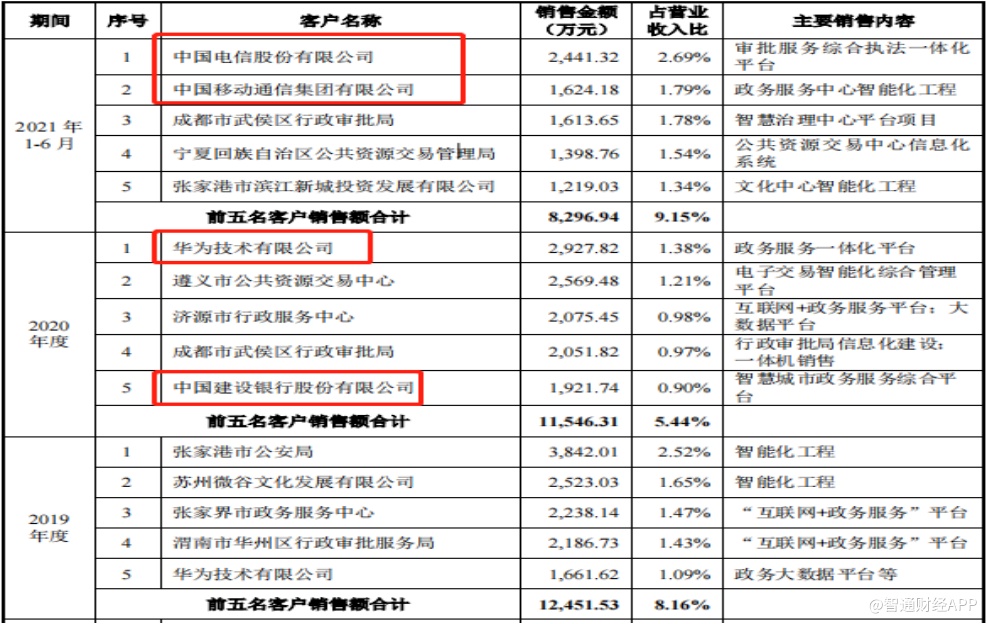 招股书显示,过去数年间新点软件基于能力建设和强大的交付和销售能力,扩展了海量优质项目与优质客户。据悉,新点软件已面向国家部委、省市县各级地方政府、住建大型集团企业及相关行业单位承建各类项目累计超6,000个,服务于数千家政府部门用户、9万余家企业用户。在这些客户中,不乏中国电信、中国移动、中国建设银行、华为等大型企业,常年占据营收榜前5位的位置。