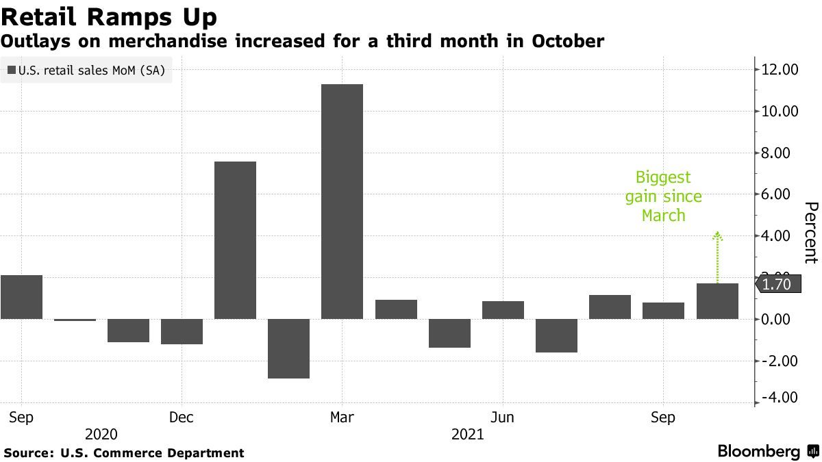 智通财经APP获悉,美国10月零售销售连续第三个月实现增长,主要因物价上涨提振商户收入,且家庭需求保持强劲。
