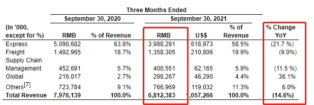 按业务划分,快递业务营收为39.88亿元,同比下降21.7%;货运业务营收13.58亿元,同比下降9.0%;供应链管理业务营收4.01亿元,同比下降11.5 %;全球业务营收2.98亿元,同比增长38.1%;其他业务营收7.67亿元,同比增长6.0%。