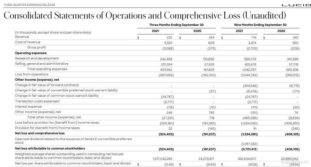 Lucid承认,2021财年的营收不到100万美元,但随着更多电动汽车下线,2022财年的营收状况将发生根本性改变。 然而,在可预见的未来,Lucid将继续出现重大亏损和负的自由现金流。 Lucid第三季度的运营亏损为4.971亿美元,自由现金流为负的3.844亿美元。