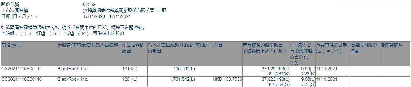 智通财经APP获悉,香港联交所最新资料显示,11月11日,贝莱德减持药明康德(02359)约178.15万股,每股作价153.7556港元,总金额约为2.74亿港元。减持后最新持股数目约为3762.65万股,最新持股比例为9.60%。