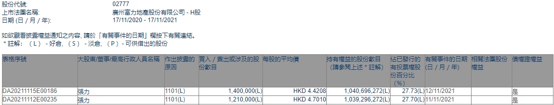 智通财经APP获悉,香港联交所最新资料显示,11月11-12日,行政总裁张力分别增持富力地产(02777)121万股、140万股,每股作价分别为4.7010港元、4.4208港元,总金额约为1187.73万港元。增持后最新持股数目约为10.41亿股,最新持股比例为27.73%。