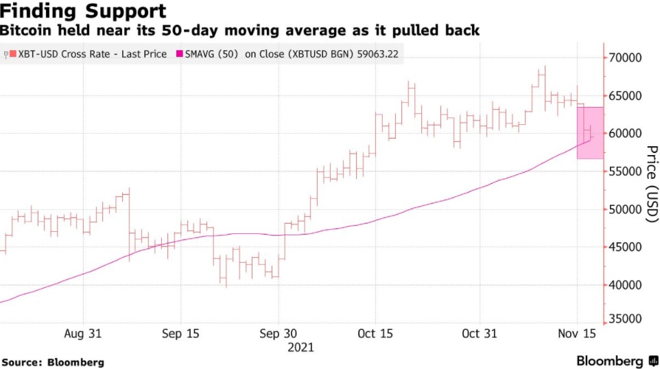 比特币在周二下跌期间位于50日移动均线附近,这为其提供了略低于周二6万美元的整数支撑。该技术指标在周三再次受到考验。