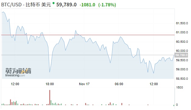 截至周三下午15:40,比特币下跌约1.78%,59789美元,连续第四天下跌。以太坊下跌2.73%,至4189美元,为10月28日以来的最低水平。市值排名靠前的加密货币在过去7天里都出现了至少10%的跌幅。