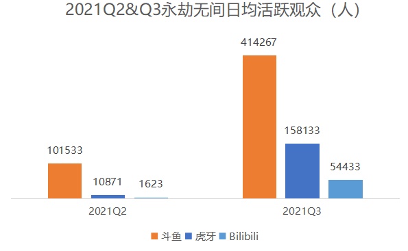 效果也十分明显。在新上线的《金铲铲之战》、《永劫无间》、《哈利波特》、《英雄联盟手游》等新游戏中,斗鱼第三季度的各项数据均十分亮眼。以大热的《永劫无间》为例,据头榜数据显示,在第三季度中,斗鱼平台该游戏的日均活跃观众数量高达41.42万人,明显碾压其他平台。