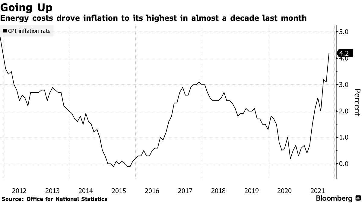 智通财经APP获悉,英国国家统计局周三公布的最新数据显示,10月份消费者价格指数(CPI)较去年同期上涨4.2%,为2011年11月以来的最高增幅。这一数字较9月份的3.1%和经济学家预期的3.9%大幅上升。
