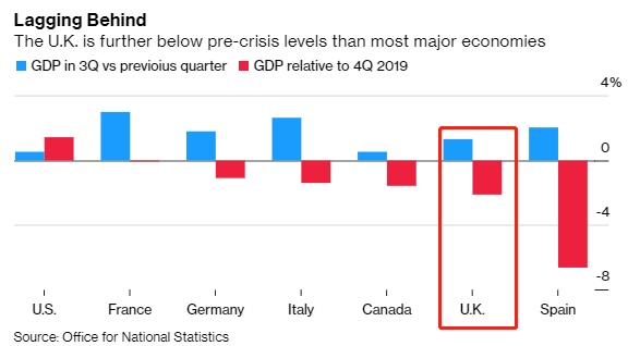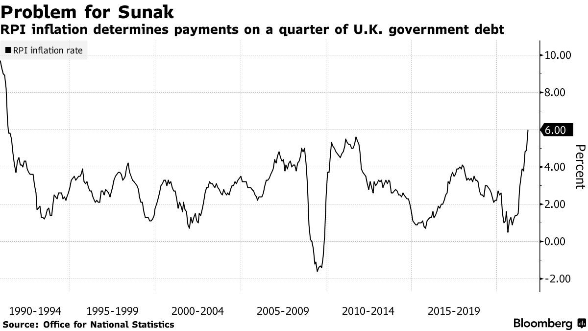 物价上涨也给英国财政大臣苏纳克带来一个问题,即它提高了与通胀挂钩的政府债券的支付成本。英国零售价格指数10月份升至6%,这是自1991年4月以来的最快增速,而这一数据决定了与该指数挂钩的金边债券的收益支付数额。