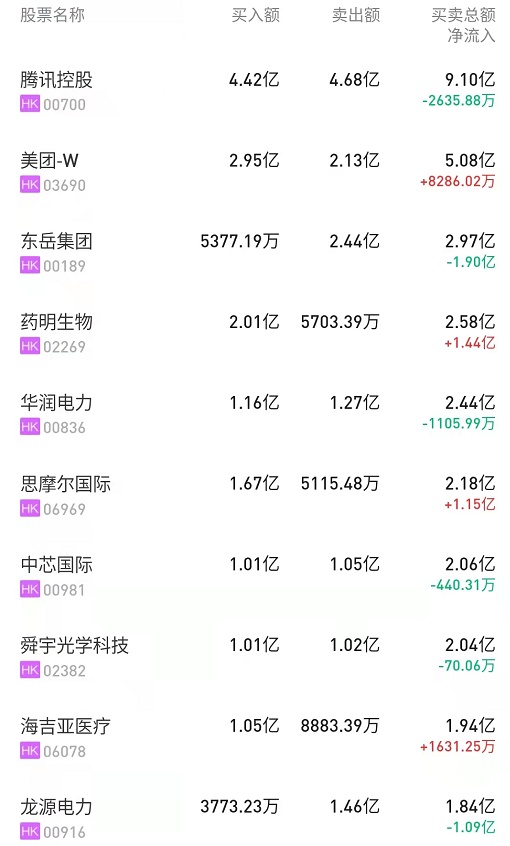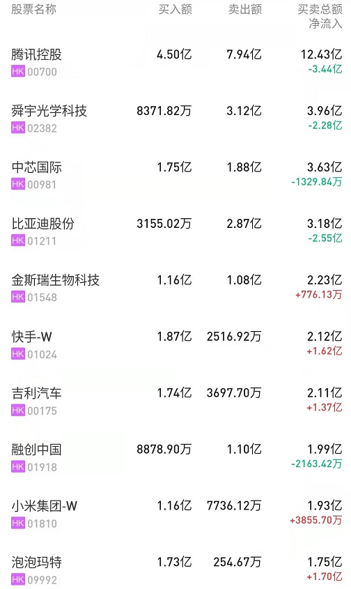 此外,吉利汽车(00175)、金斯瑞生物科技(01548)分别获净买入1.36亿、776万港元。而龙源电力(00916)、中芯国际(00981)、华润电力(00836)分别遭净卖出1.08亿、1770万、1105万港元。