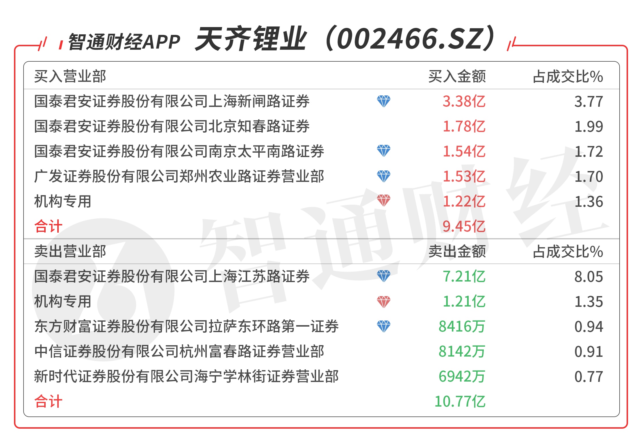 天齐锂业(002466.SZ): 多主力现身龙虎榜,机构席位对倒净买入3360万元,买一是知名游资的席位买入3.38亿元,买三是知名游资作手新一的席位买入1.54亿元,当日买卖均衡,该股今日强势涨停回补跳空缺口,压力位在60日线附近。