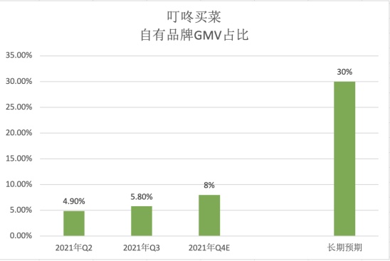 叮咚买菜方面披露,其2021年三季度的主要自有品牌在相关品类的GMV占比已达到27.0%,同比提升22.6个百分点。长期来看,叮咚买菜自有品牌的占整体GMV的比例将从今年三季度的5.8%提升到30%左右。