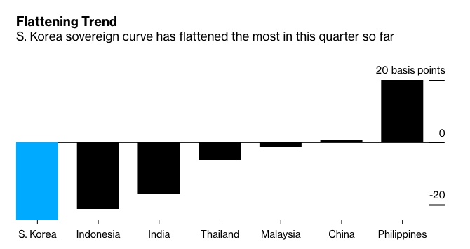 本季度,韩国3年期和10年期国债收益率差已下降26个基点,在亚洲新兴市场国家中,收益率曲线最为平坦。DBS Bank表示,这反映出投资者押注今年开始的加息周期将在2022年结束,而此时其他国家央行也将开始加息。