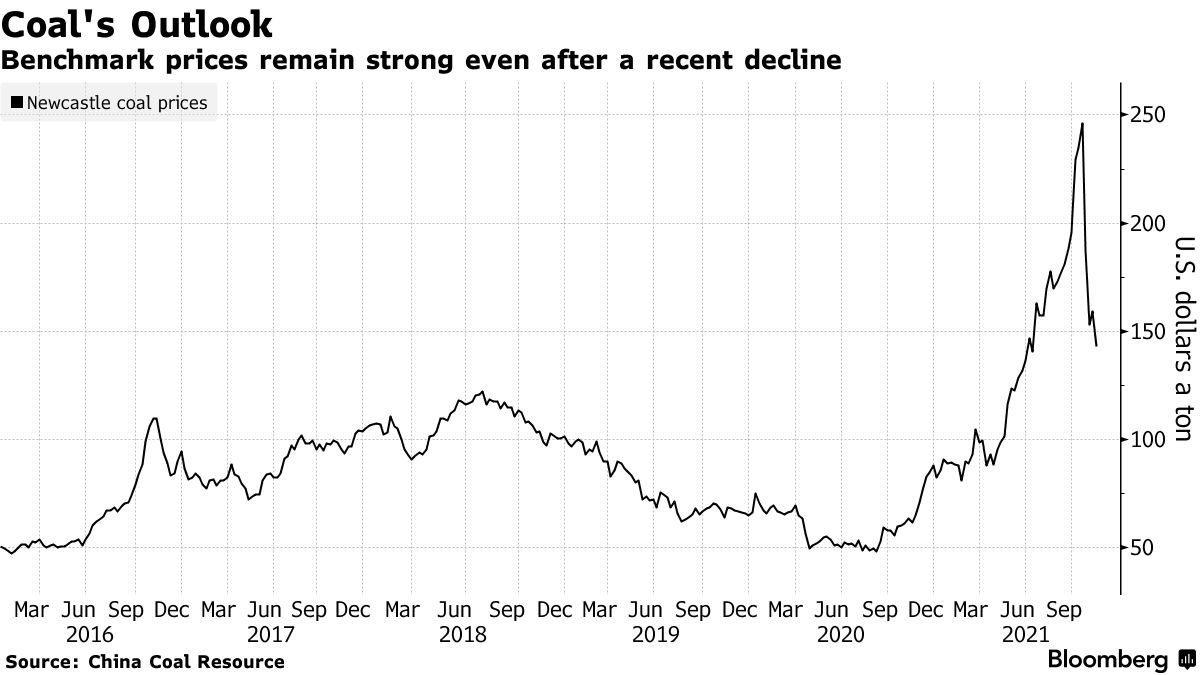 由于供应紧张,以及亚洲各国都在努力应对电力短缺,澳大利亚纽卡斯尔港高质量动力煤的基准价格上月飙升。尽管煤炭价格较10月18日的创纪录高点下跌了约42%,但其交易价格仍远高于过去五年的平均价格。
