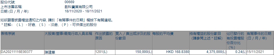 智通财经APP获悉,香港联交所最新资料显示,11月15日,执行董事陈建华减持创科实业(00669)15万股,每股作价168.838港元,总金额为2532.57万港元。减持后最新持股数目约为437.5万股,最新持股比例为0.24%。