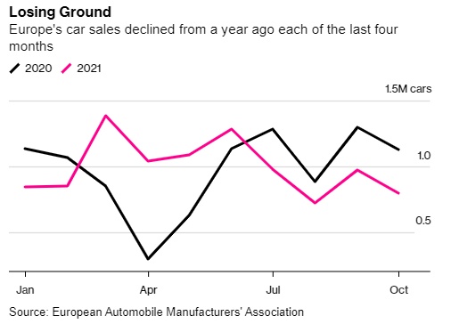 今年前10个月,欧洲新车累计销量也仅比2020年同期增长2.7%。