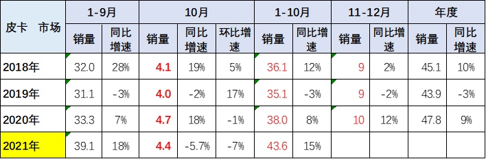 智通财经APP获悉,乘联会发布2021年10月皮卡市场分析报告,数据显示,2021年10月份皮卡市场销售4.4万辆,同比下降5.7%,环比下降7%。由于疫情后回暖较强,今年10月同比2019年同期增长10%。
