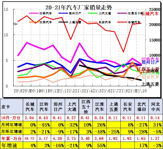 皮卡今年1-10月增长15%也是强于总体乘用车和卡车市场的较好表现。近几年皮卡成为乘商结合的消费的新热点,持续表现较强。近期皮卡车企努力跟上时代潮流,龙头主力车企长城汽车受到芯片短缺影响提升速度放缓,江铃汽车、郑州日产和江西五十铃表现很好。上汽通用五菱等新进入车企强势低价布局并占据二线主力销量地位,部分传统皮卡企业面临巨大的增长压力。