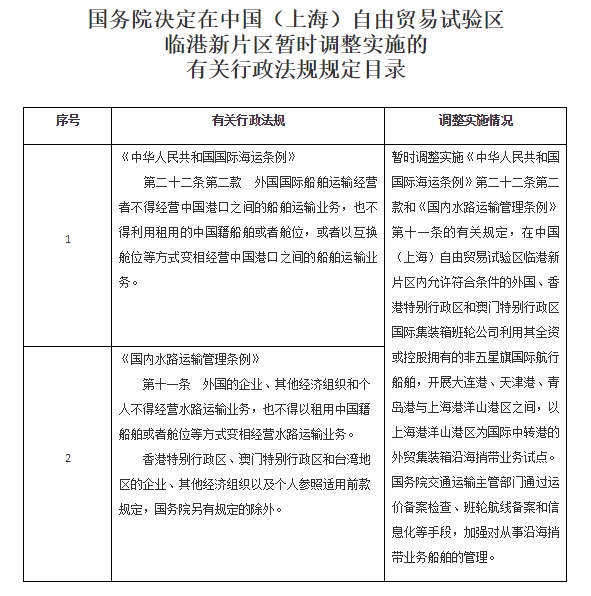 一、按照《中国(上海)自由贸易试验区临港新片区总体方案》,同意自即日起至2024年12月31日,在中国(上海)自由贸易试验区临港新片区暂时调整实施《中华人民共和国国际海运条例》、《国内水路运输管理条例》的有关规定(目录附后)。