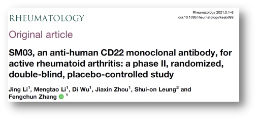 此前,SM03已在I期临床试验中初步显示治疗RA的有效性,此项II期前瞻性、多中心临床试验,旨在进一步探索评估SM03治疗活动性RA患者的疗效及安全性(在稳定剂量MTX背景治疗下)。