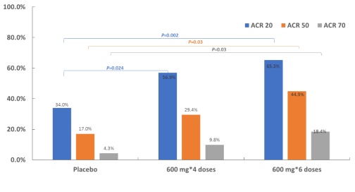 在接受MTX背景治疗的中重度活动性RA患者中,SM03每次600mg、两种累积剂量3600mg和2400mg,在为期24周的治疗期内具有良好的疗效及耐受性。与安慰剂相比,SM03可有效降低接受稳定剂量MTX治疗的中重度RA患者的疾病活动度,减轻RA症状和体征。研究显示,与低剂量SM03相比,高剂量SM03可为RA患者带来更快、更显着的临床获益。这也支持了在RA患者中开展高剂量SM03的III期临床试验。
