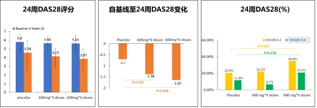 另外,24周时,SM03两治疗组的DAS28自基线改善情况均优于安慰剂组。高剂量组24周达到低疾病活动(LDL)和临床缓解(remission)者多于安慰剂组(图3)