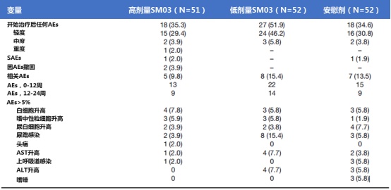 整体上,不良事件(AEs)发生率为40.6%(63/155),治疗组和对照组没有明显区别。资料显示,不良事件多为轻度,三组间的不良事件发生率无显着性差异(高剂量组35.3%;低剂量组51.9%;安慰剂组34.6%)。接受SM03治疗的患者中,有13例(12.6%)患者报告有治疗相关感染,其中3.9%患者出现在高剂量组(表1)。