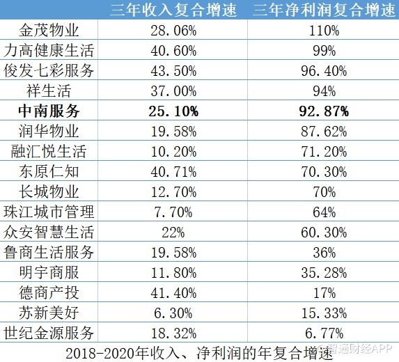中南服务的优质,在目前正排队上市的众多物企中都是显而易见的。智通财经APP对正排队上市的16家(不完全统计)物企做了梳理,从数据能看到,无论是收入、还是净利润,物企之间呈现出明显的分化,其中不乏仅个位数增长的企业。而从盈利角度来看,2018至2020年净利润复合增速超90%的企业仅有5家,中南服务便是其中之一。