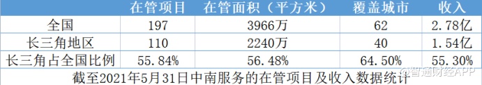 据招股书显示,截至2021年5月31日,中南服务有197个在管项目,在管总建筑面积3966万平方米,覆盖中国17个省、市、自治区的62个城市。其中,位于长三角地区的在管项目为110个,在管面积达2240万平方米,覆盖长三角地区的40个城市。