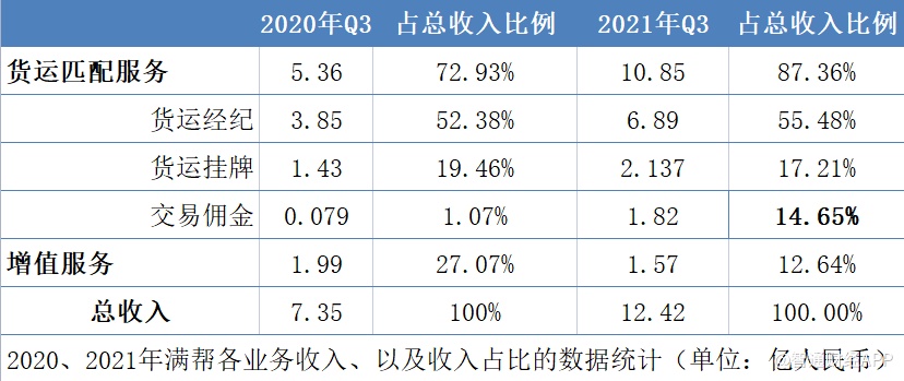 需求与履约率的提升自然在业务端有所体现。报告期内,核心的货运匹配业务收入为10.85亿元,同比大增102.6%。其中,货运经纪、货运挂牌、交易佣金业务的收入均有不同程度的增长,而交易佣金业务则最为亮眼,其收入同比增长超22倍至1.82亿元。增值服务收入的下滑则是因为战略客户激励计划以及新的盈利举措的实施。