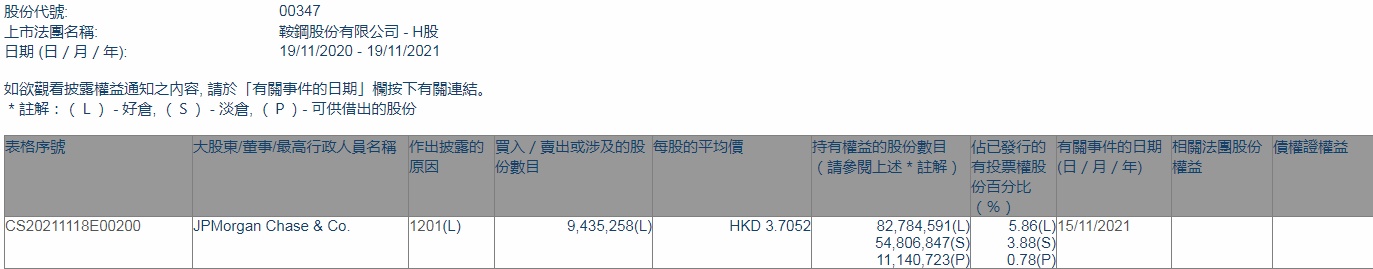 智通财经APP获悉,香港联交所最新资料显示,11月15日,小摩减持鞍钢股份(00347)约943.53万股,每股作价3.7052港元,总金额约为3495.95万港元。减持后最新持股数目约为8278.46万股,最新持股比例为5.86%。