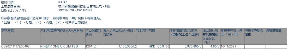 智通财经APP获悉,香港联交所最新资料显示,11月16日,NINETY ONE UK LIMITED减持泰格医药(03347)110.53万股,每股作价130.9100港元,总金额约为1.45亿港元。减持后最新持股数目为597.68万股,最新持股比例为4.85%。