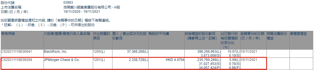 智通财经APP获悉,香港联交所最新资料显示,11月15日,小摩减持洛阳钼业(03993)233.8728万股,每股作价4.4764港元,总金额约为1046.91万港元。减持后最新持股数目约为2.36亿股,最新持股比例为5.99%。