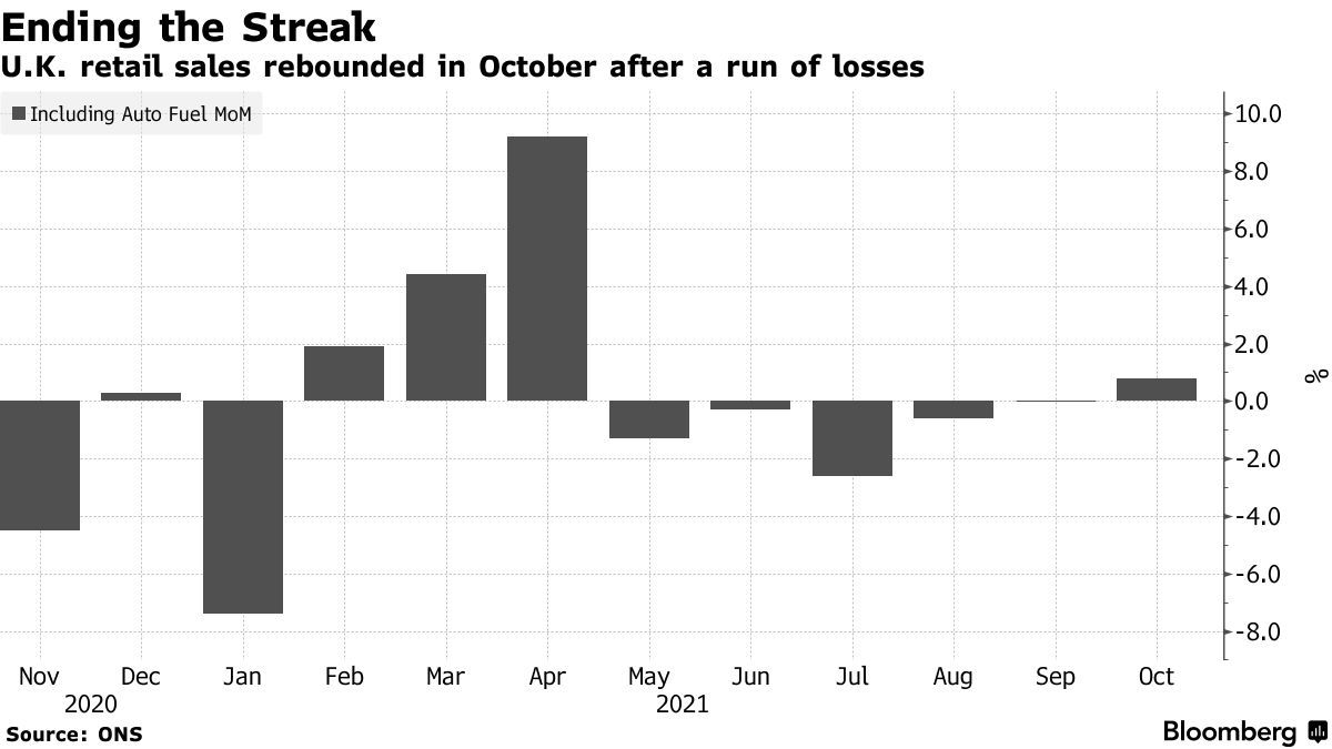 智通财经APP获悉,英国国家统计局(ONS)今日公布的最新数据显示,10月份零售销售额(包括实体店和线上商品销售)环比增长0.8%,超过经济学家此前普遍预计的0.5%。自5月份以来,该数据首次实现环比正增长。