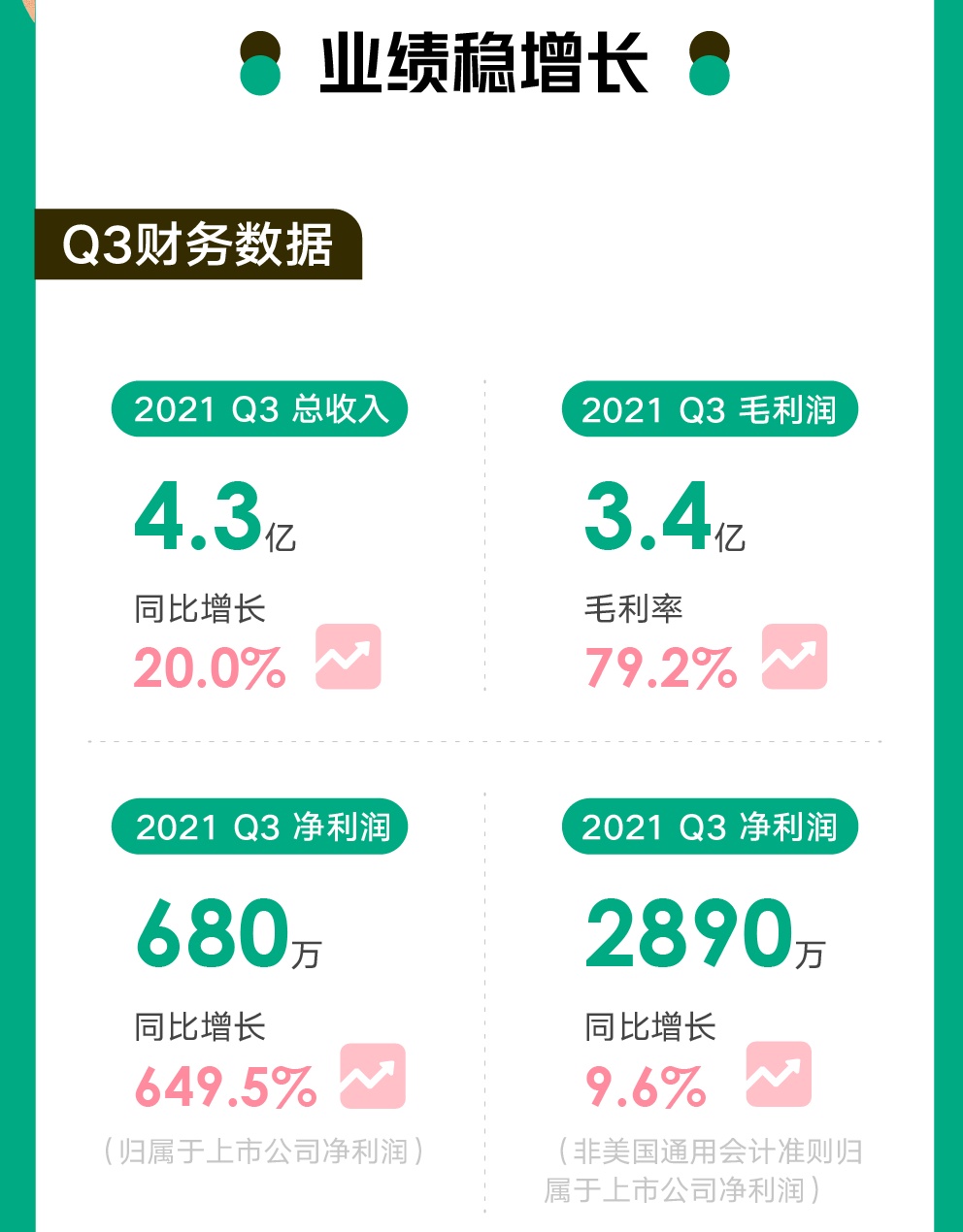 在收入持续增长的同时,新氧盈利能力也不断提升。第三季度,新氧实现毛利润3.418亿元,保持毛利率在79.2%的高位。本季度,归属于上市公司净利润680万元,同比增长649.5%,非美国通用会计准则归属于上市公司净利润2890万元,同比增长9.6%。