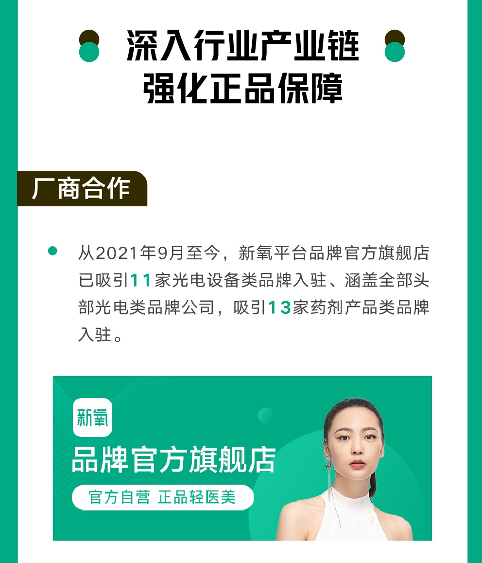 从今年9月至今,新氧平台品牌官方旗舰店已吸引11家光电设备类品牌入驻,涵盖Fotona欧洲之星、Lumenis科医人、Alma以色列飞顿激光等全部头部光电类品牌公司,并吸引13家药剂产品类品牌入驻。