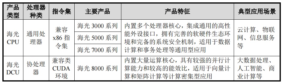 从业务结构来看,海光信息的主营业务是研发、设计和销售应用于服务器、工作站等计算、存储设备中的高端处理器,产品主要包括海光通用处理器(CPU)和海光协处理器(DCU)。