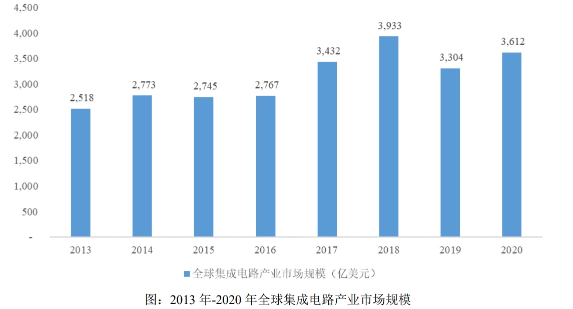 首先来看整个集成电路行业的发展态势。据全球半导体贸易统计数据显示,2013至2018年,全球集成电路行业快速增长,产业收入年均复合增长率9.33%;2019年受国际贸易摩擦影响,全球集成电路产业总收入为3304亿美元,同比下降15.99%;2020年因贸易摩擦缓解,加之数据中心设备需求增加、5G商用带动各种服务扩大、车辆持续智能化等因素,2020年全球集成电路产业市场规模为3612亿美元,同比增长9.32%,市场重回增长态势。