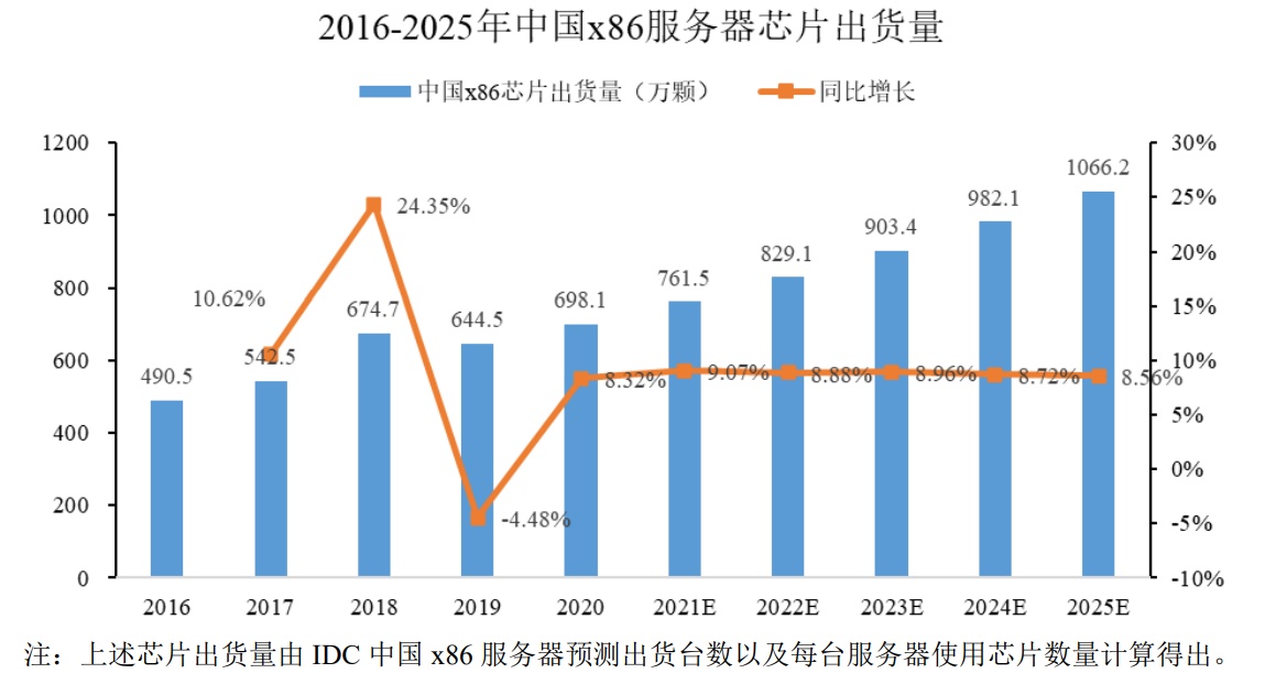 根据IDC中国x86服务器市场出货量和路数分布情况进行推算,2020年中国x86CPU芯片出货量为698.1万颗。假设2021年至2025年路数分布情况与2020年保持一致,则2021年芯片出货量将增长9.1%,2022年至2025年将保持9.0%左右的增长,预计在2025年芯片可以达到1066.2万颗,x86CPU芯片未来在我国仍会拥有广阔的市场空间。
