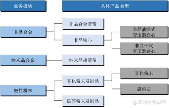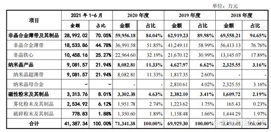 其中非晶合金薄带及其制品非晶铁心为公司主营业务收入的主要来源,2021年上半年该业务收入2.9亿元,占比70.05%。