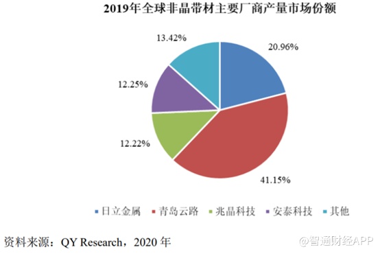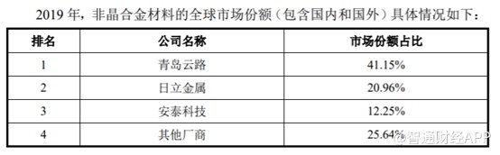 2019年,公司非晶合金薄带的产量全球排名第一,市场占有率为41.15%,是非晶合金材料行业的龙头企业。