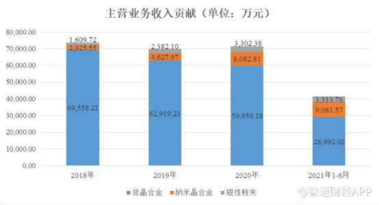非晶合金板块为公司的传统核心业务,包括非晶合金薄带和非晶铁心。由于非晶合金薄带竞争逐步加剧,近几年该业务呈现下降趋势,从2018年的76.76%下降至2021年上半年的44.78%。