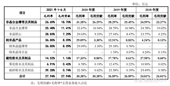 招股书显示,2021 年上半年,公司非晶合金薄带及其制品的毛利率较 2020 年全年下降4.59个百分点,较 2020 年同期下降4个百分点,主要为2021年上半年美元贬值,导致公司外销单价下降,上半年非晶合金薄带和非晶铁心的平均单价分别较2020年全年下降 7.76%和3.82%。