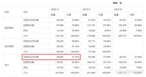 国内配电变压器市场格局中呈现以硅钢变压器为主、非晶合金变压器为辅的结构。综合国家电网和南方电网的招标数据情况,2020年国内非晶合金变压器的市场份额占比约为27%。