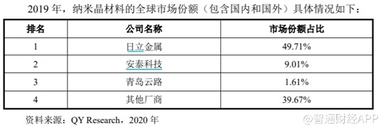 在纳米晶材料方面,由于公司纳米晶超薄带产品 2019 年年中才正式投产,市场占有率较低。日立金属纳米晶材料产量居全球首位,市场占有率49.71%,安泰科技市场占有率为9.01%,位居第二。