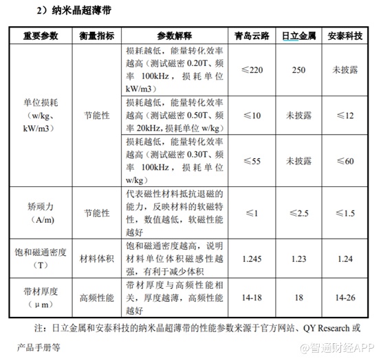 不过作为后起之秀,云路股份的技术实力并不在安泰科技之下,其研发的纳米晶超薄带,能够满足手机无线充电等产品对于关键部件材料尺寸的需求;并且已突破厚度14μm纳米晶带材的批量生产技术,已具备12-14μm厚度的样品生产能力,同时正在研发10-12μm的纳米晶超级薄带样品,将有助于解决我国在关键材料技术上的“卡脖子”难题。