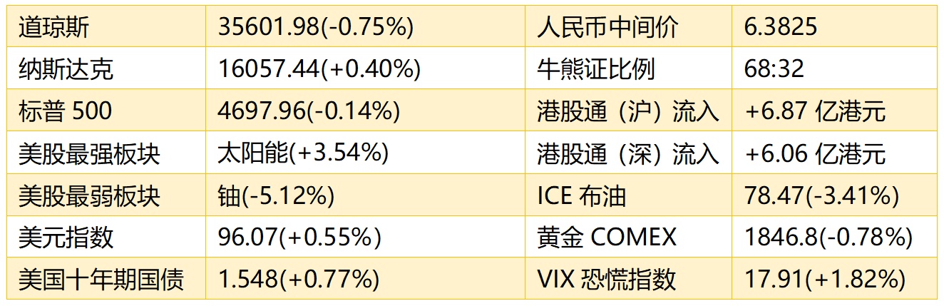 1、 隔夜美股截至上周末收盘,道指跌268.97点或0.75%,报35601.98点;纳指涨63.73点或0.4%,报16057.44点;标普500指数跌6.58点或0.14%,报4697.96点。上周道指下跌1.38%,标普500指数上涨0.32%,纳指上涨1.24%。港股ADR指数下跌,按比例计算,收报24907点,跌141.63点或0.57%。