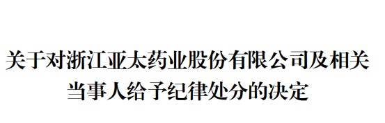 深交所作出如下处分决定:一、对浙江亚太药业股份有限公司给予公开谴责的处分;二、对浙江亚太药业股份有限公司时任董事、上海新高峰生物医药有限公司董事长兼总经理任军,浙江亚太药业股份有限公司时任董事长兼总经理、上海新高峰生物医药有限公司董事陈尧根给予公开谴责的处分;三、对浙江亚太药业股份有限公司董事、时任总经理吕旭幸,董事、财务总监何珍,董事钟婉珍,董事、董事会秘书、时任副总经理沈依伊,时任董事会秘书、副总经理孙黎明,时任董事平华标,独立董事詹金彪、何大安、莫国萍,监事成华强、赵科学、王国贤,副总经理胡宝坤、王丽云、谭钦水给予通报批评的处分;四、对浙江亚太药业股份有限公司时任董事、上海新高峰生物医药有限公司董事长兼总经理任军,浙江亚太药业股份有限公司时任董事长兼总经理、上海新高峰生物医药有限公司董事陈尧根给予公开认定 5 年内不适合担任上市公司董事、监事、高级管理人员的处分。