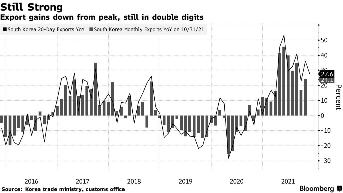 智通财经APP获悉,韩国海关今日公布的数据显示,本月前20天韩国的海外出口额增长了27.6%,在整个10月份增长了24%。另外,在原油、天然气及相关产品采购成本上涨的带动之下,韩国进口额激增41.9%。