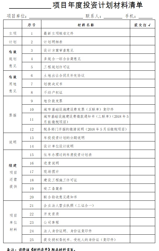 (四)项目材料清单详见附件。请建设单位按照《项目材料清单》准备每个项目纸质材料,加盖单位公章,并按顺序装订,由各区发展改革委、住房城乡建设委按照审批权限分别报送至市发展改革委投资处、市住房城乡建设委开发处、副中心党工委发展改革局、临空经济区(大兴)管委会。