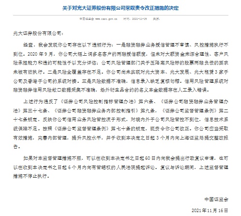 智通财经APP获悉,据证监会11月19日消息,证监会对光大证券(601788.SH)采取责令改正措施。经查,证监会发现光大证券存在以下违规行为:一是融资融券业务授信管理不审慎、风控措施执行不到位;二是风险全覆盖存在不足;三是风险数据不准确,信息录入缺乏复核勾稽。上述行为违反证监会相关规定,且反映光大证券信用业务风险管控流于形式,对境内外子公司风险管控不到位,信息技术系统保障不足。